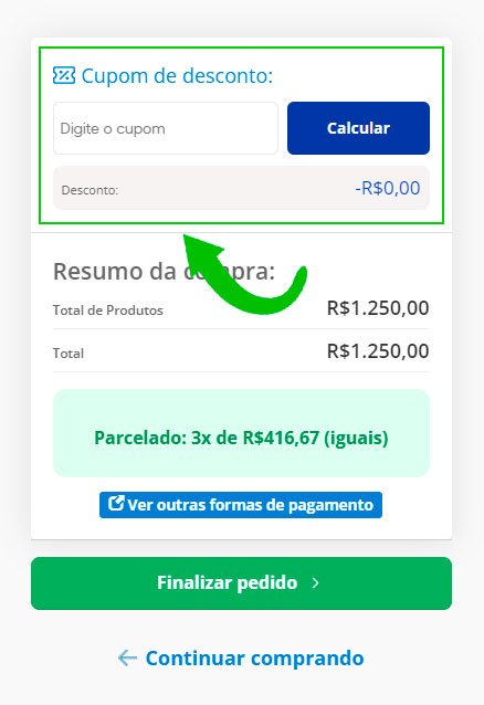 Adicione os produtos que desenha no carrinho de compras, clique em ir para o carrinho, adicione o códico do cupom de desconto e clique em finalizar pedido.